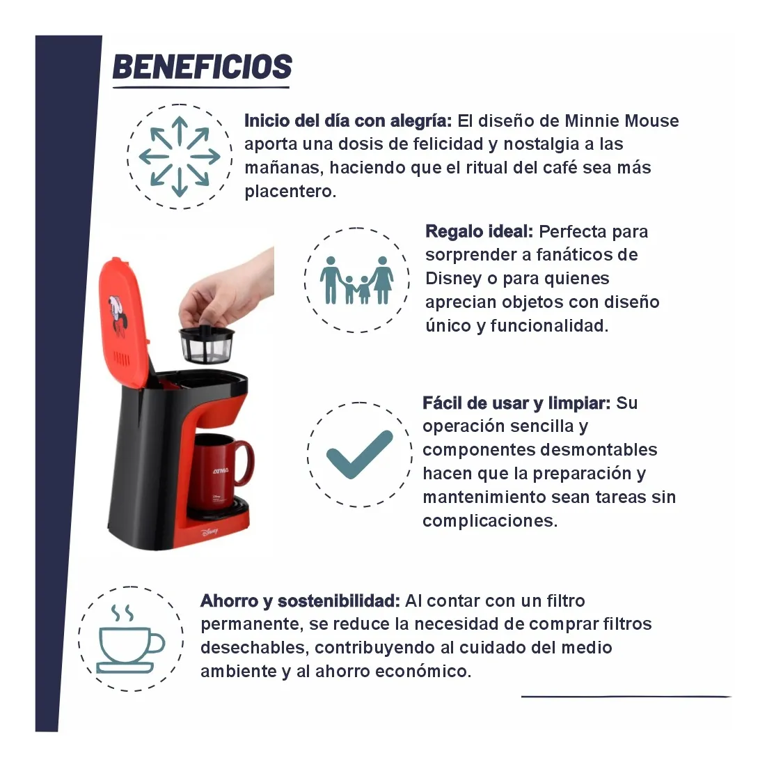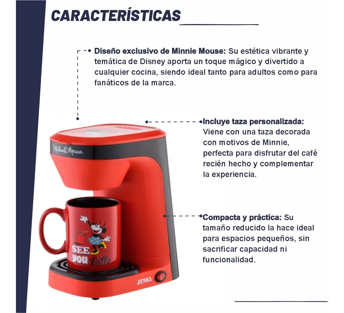 Diseñada para quienes valoran la practicidad y un toque único, esta cafetera personal combina funcionalidad con el encanto del icónico personaje. Con un diseño compacto y vibrante, es perfecta para darle un toque especial a tu cocina o para regalar a un fanático de Minnie. Viví momentos únicos con el estilo inconfundible de Atma.