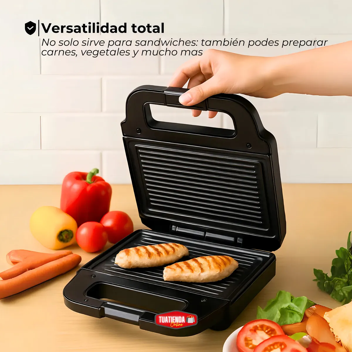 Su diseño compacto incluye placas intercambiables antiadherentes, fáciles de colocar y limpiar, que te permiten cocinar de forma más saludable con menos aceite. Además, su potencia y distribución uniforme del calor aseguran una cocción pareja en cada preparación.